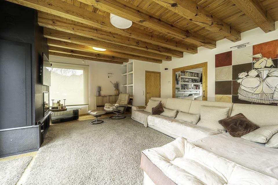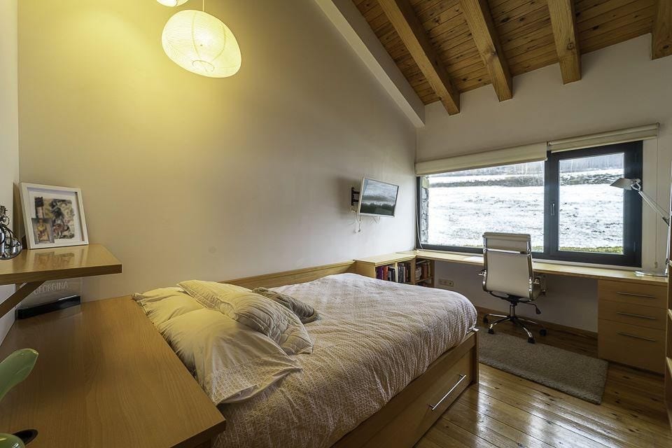 Le rez-de-chaussée comprend un grand séjour très confortable avec cheminée et grandes baies vitrées ouvrant sur le jardin. Les plafonds ont des poutres en bois qui créent une chaleur très agréable. À l'autre bout de la pièce, se trouve la salle à manger semi-ouverte, offrant également une magnifique vue panoramique sur le jardin, un lieu idéal pour profiter des réunions entre amis et en famille. La cuisine, entièrement équipée, communique avec le salon-salle à manger par des portes coulissantes et comprend un garde-manger pratique. A ce même niveau, il y a des toilettes de courtoisie et une pièce idéale pour les invités ou pour l'aménager en bureau.